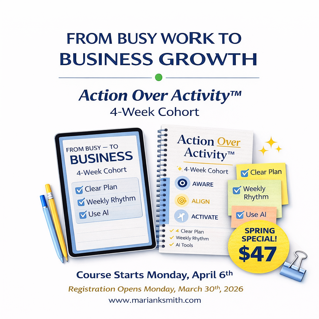 Action Over Activity™ is a 4-week live cohort for direct sellers who are ready to stop spinning their wheels and build a focused, repeatable plan — using simple systems and smart AI tools.